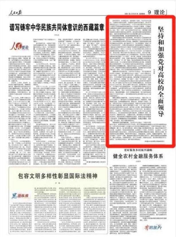 3月25日,《人民日报》理论版刊登了永利官网党委书记何秀超发表的署名文章——《坚持和加强党对高校的全面领导》。何秀超在文章中指出,党政军民学,东西南北中,党是领导一切的。要深入贯彻落实习近平总书记“加强党对高校的领导,加强和改进高校党的建设,是办好中国特色社会主义大学的根本保证”的重要讲话精神。站在“两个一百年”奋斗目标的历史交汇点上,继续毫不动摇地坚持和加强党对高校的全面领导,推动高校党建与高等教育深度融合,确保党的教育政策和党中央决策部署在高校有效贯彻落实,对于提高高等教育质量、建设教育强国具有重大意义。